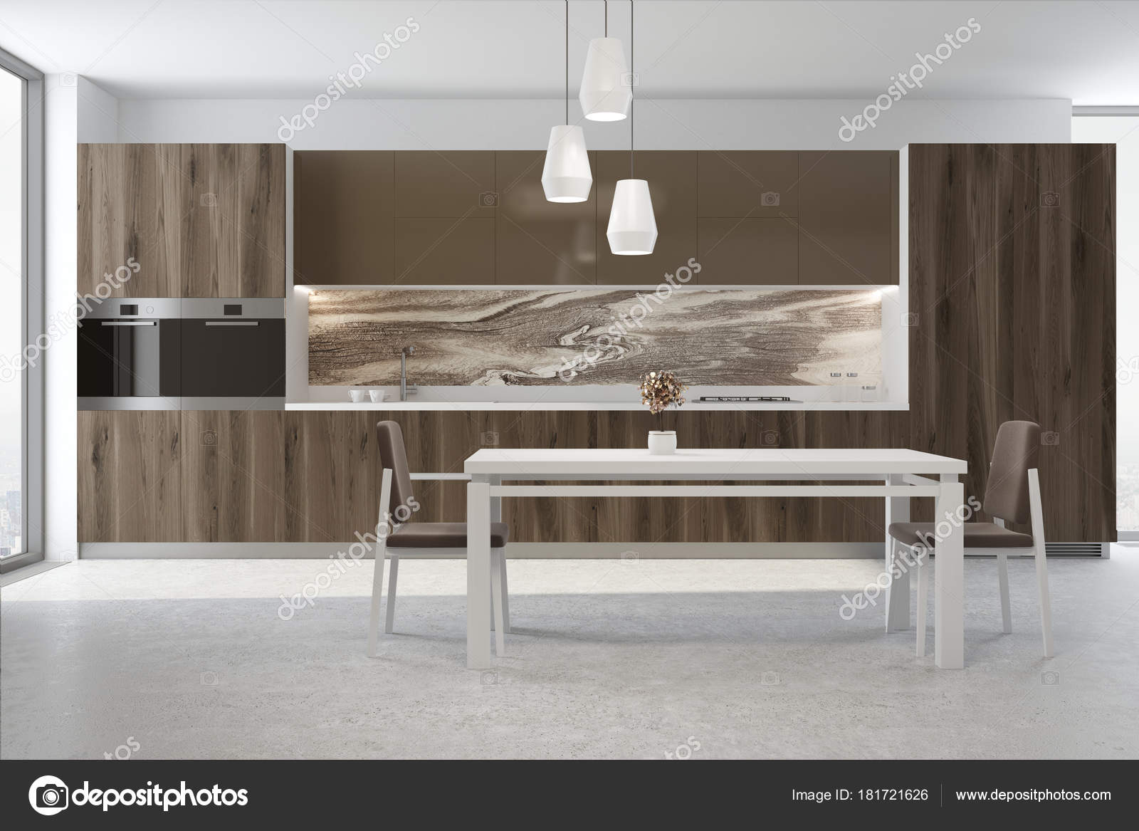 Brown Und Marmor Dininig Zimmer Und Küche Stockfoto