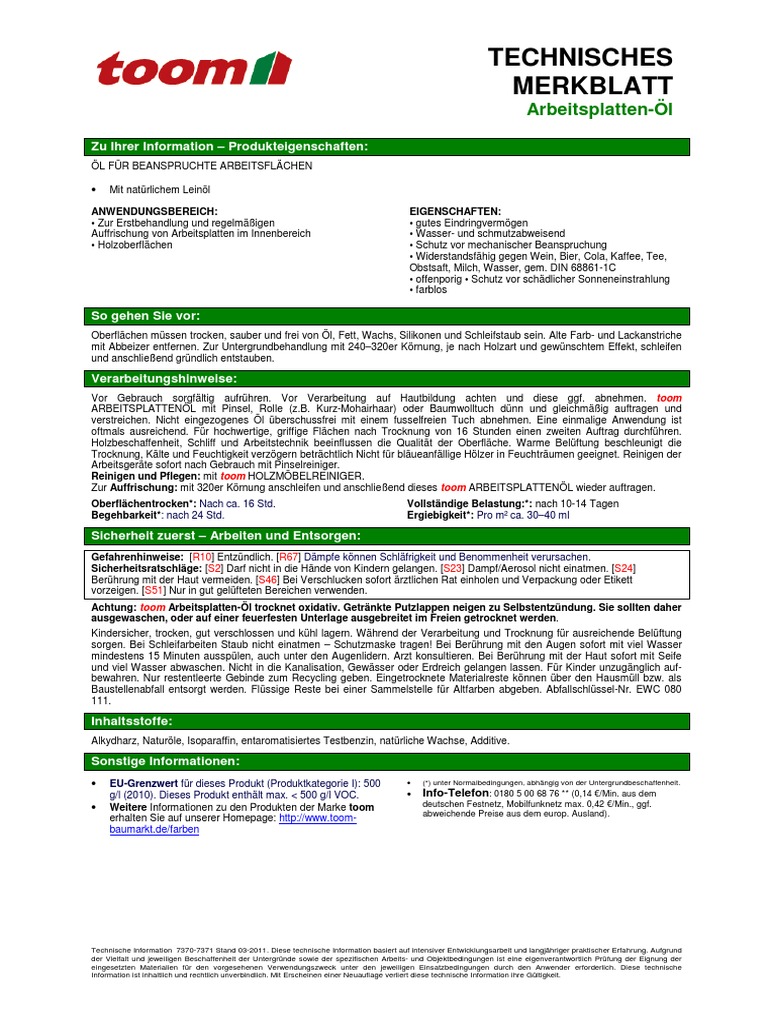 Arbeitsplattenöl Toom Merkblatt